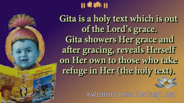 Gita is a holy text which is out of the Lord’s grace. Gita showers Her grace and after gracing, reveals Herself on Her own to those who take refuge in this holy text. I have seen such people, who had no knowledge of Sanskrit, but they were able to translate the meaning ! Even though they may not know the language, the principles of Gitaji, the feelings and sentiments come into their mind. Approximately 60-65 years back, there was an accountant in Calcutta. He did not know how to write pure hindi. One day he said, I wish to memorize the Gita; but it is not financially feasible for me to pay a teacher. I said to him, you prostrate in front of God, take refuge in Him, and start to read the Gita. He went home, kept the Lord’s picture in front of him, lit a candle and some incense, offered some flowers and saying “Krishnam Vande Jagatgurum” began to read the Gita. In due time, he memorized the Gita. I heard him recite the eighteen chapters with all the other attendees. There was very few flaws in his recitation.