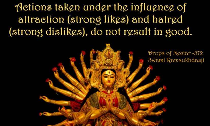 Likes (Attachment, Love, Passion, Raag) and Dislikes (Aversion, Hatred, Dvesh) are incoming, transient, alterations of the inner senses, they are not one’s natural tendencies (dharma). Dharma remains firm and stable, whereas changes are temporary, i.e. they are the kind that come and go. As attraction (likes) and aversion (dislikes) are intermittent conditions that come and go in the inner faculty (mind, intellect, ego), they can be wiped out.