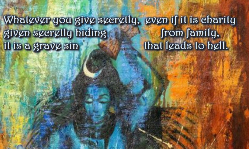 Remember – Whatever you give secretly, even if it charity given secretly, by hiding from family, it is a grave sin that leads to hell. So, don’t engage in such activities. You will face a pitiful state. (dur dashaa).