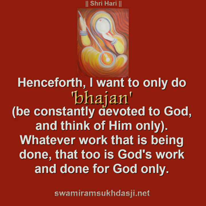 There isn’t significant spiritual progress or improvement for such people. They do not perceive this satsang as being of great value (graahiya – drhsti). There is a big difference between ordinary view and one that has great value. We listen to satsang to convince, console, cajole our mind. We do not take it in and hold on to it. Satsang is to be seen with an eye that sees it as worthy of acceptance and the feeling should be that henceforth, I want to only do ‘bhajan’ (be devoted to God, remember and think on only Him, uninterruptedly). Whatever work we undertake, that too is only God’s work and done for God only. If all work is done with this view, by having a relation with God, then there can be immense benefit.