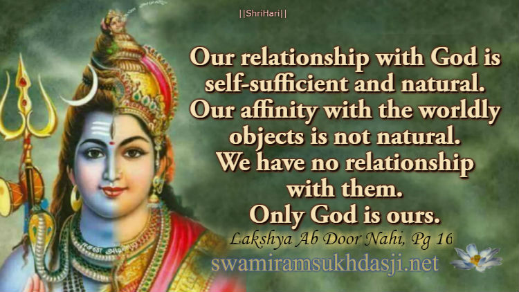 Our relationship with God is self-sufficient and natural. Our affinity with the worldly objects is not natural. Mind, intellect, senses, body etc., and all objects are constantly flowing away. We have no affinity with them. Only God is ours. A child has no qualifications, no scholarliness, no valor, etc. The only thing he has is a very close affinity with the mother, that ‘The mother is mine’. There is immense power in this affinity (this sense of mine-ness), which can even draw God towards his devotee. It is due to this that the great devotee Prahlad was able to evoke God even from a stone –